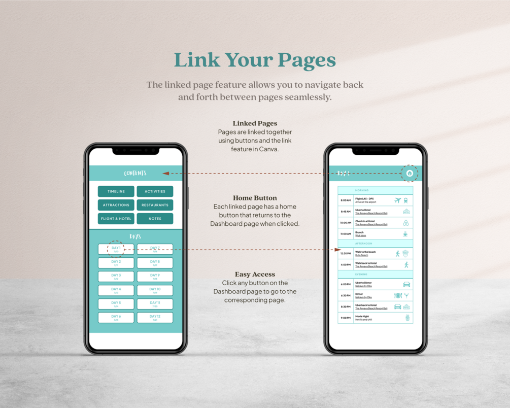 This travel planner template is completely editable and you can customize it using the free version of Canva. It’s optimized for mobile viewing—perfect for any smartphone and easy to share with other members of your trip! The linked page feature allows you to navigate back and forth between pages seamlessly.